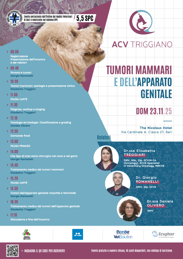 Una giornata di approfondimento dedicata alle neoplasie mammarie e genitali del cane e del gatto, con focus su eziologia, diagnosi, stadiazione e gestione terapeutica, in un’ottica integrata tra approccio medico e chirurgico.